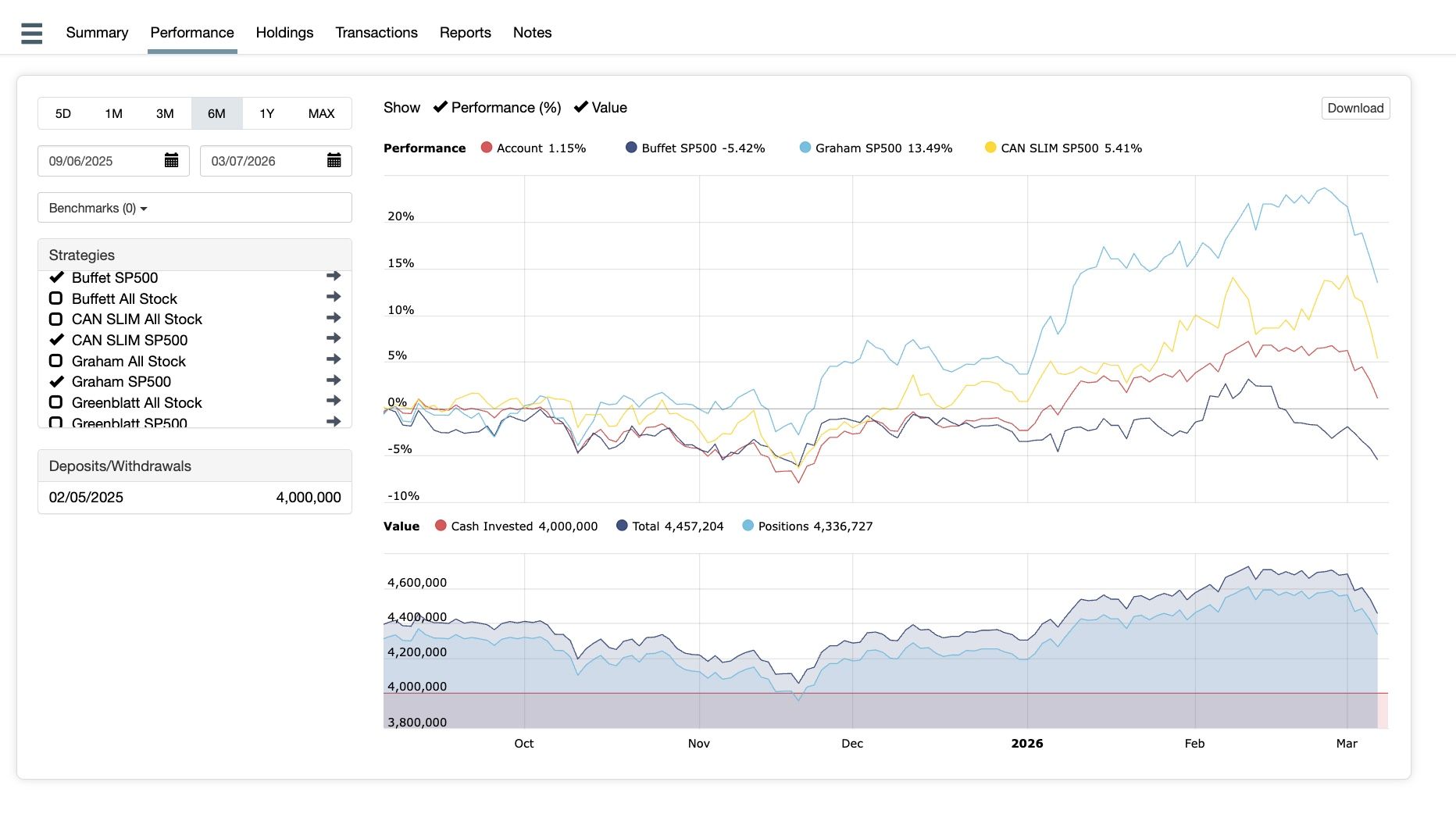 - Research-based CAN SLIM, Buffett, and Graham portfolios built on S&P 500 and NYSE/AMEX universes