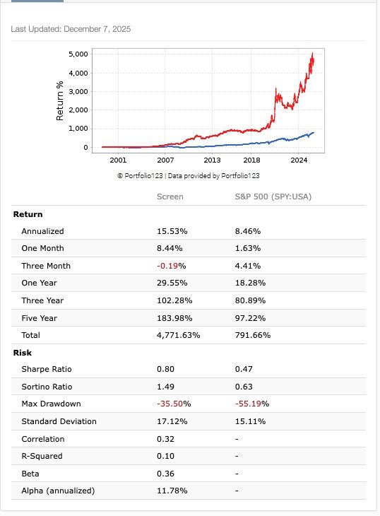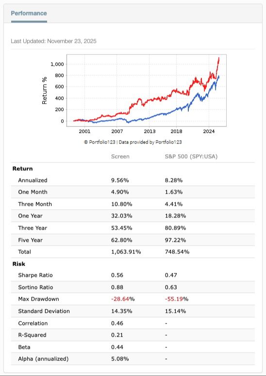 The screen rules and indicator breakdown for a daily rebalance is shown in the 2025 Journal of Investing Publication below. This signifies the historical validity and statistical significance of the study while maintaining a practical update to real time investing shown in the two images above with passing recommended stocks updated weekly.